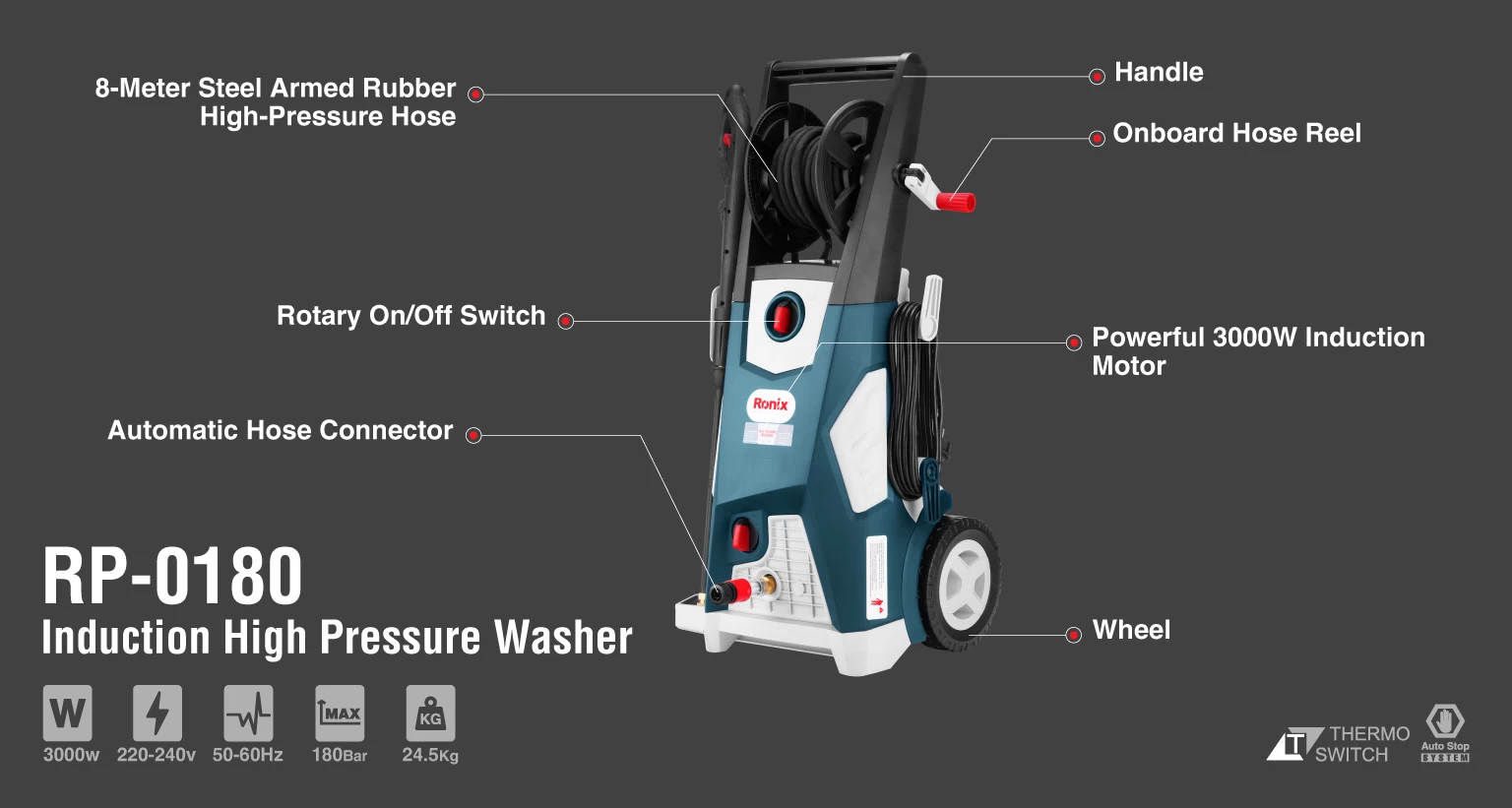 کارواش RP-0180 رونیکس با موتور دینامی (اینداکشن) ساخته شده که نسبت به موتورهای ذغالی دوام و توان بیشتری دارد. مشخصات فنی این دستگاه به شرح زیر است: