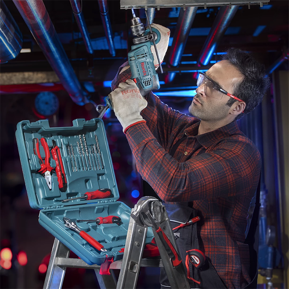 اگر به دنبال یک دریل قدرتمند با قابلیت چکشی هستید که علاوه بر قدرت بالا، ابزارهای لازم را هم در یک مجموعهی کامل داشته باشد، کیت دریل برقی چکشی 13 میلی متری رونیکس مدل RS-0001 انتخابی عالی است.